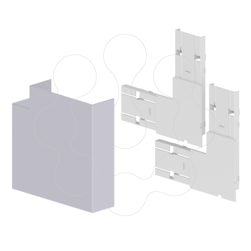 Ângulo plano Unex cor alumínio 50x150 em U24X. Para alterar a direção 90º. Cor alumínio. Material isolante. facilidade de instalação. A peça interior permite a medição evidente da tampa e retém os cabos. Pode-se cortar a aba para encostar, encastrar ou derivar a outra calha. A peça exterior cobre as imprecisões dos cortes da tampa e da base. proteção contra danos mecânicos grau IK07.